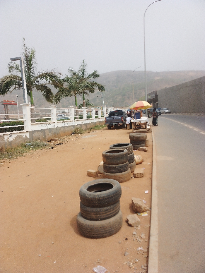 This image depicts a roadside scene in Jiru, Nigeria, characterized by a wide dirt shoulder on the left and a paved asphalt road on the right. The sky is hazy and bright, with distant, undulating hills visible in the background. In the foreground on the dirt shoulder, multiple stacks of worn vehicle tires are arranged, interspersed with loose rocks and debris. Three prominent stacks are visible, each composed of two to three tires. To the left, a low white fence with decorative pillars runs along a planted area containing several tall palm trees and modern streetlamps. A dark-colored pickup truck is parked facing away from the viewer near this fence. Mid-ground on the right, adjacent to the paved road, a street vendor's setup is visible under a distinctive yellow, orange, and white striped umbrella. A white cart or table is positioned beneath the umbrella. At least two individuals are discernible near the vendor's stand, and one person is near the rear of the parked pickup truck. A tall, curving streetlamp pole extends over the road on the right side. Further down the paved road, a tall, grey wall runs parallel to the street, and additional vehicles are parked or moving in the distance.