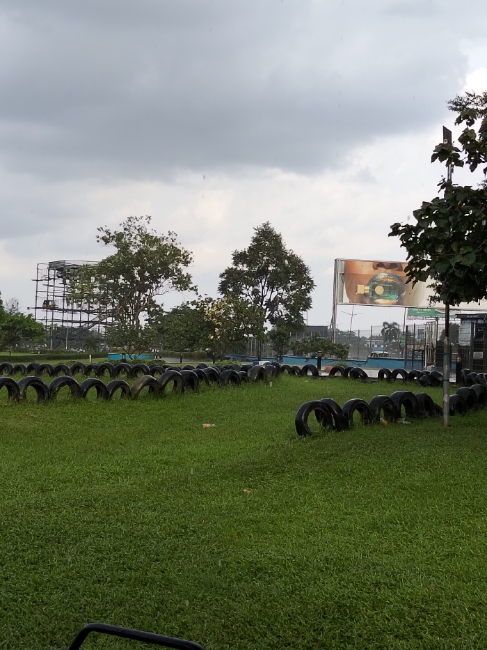 An outdoor scene in Rumuomasi, Nigeria, depicts a grassy expanse under an overcast sky. In the foreground, numerous black vehicle tires are partially embedded upright in the manicured green lawn, arranged in curved rows, possibly delineating a track or boundary. Small pieces of litter are visible on the grass. The lower edge of a black metal object, likely part of a seat or equipment, is visible at the bottom center. In the midground, a paved surface, likely a road or pathway, runs horizontally, bordered by a low blue concrete or metal barrier. Several large trees with dense green foliage are scattered across this area. To the left, a multi-story, open-framework metal structure, possibly a parking garage or an adventure course, is visible behind the trees, with a small, light-colored vehicle or equipment piece on one of its levels. The background features a uniform grey, cloudy sky. To the right, a large billboard displays an advertisement featuring a close-up of a human mouth with golden or metallic lips and a teal-colored object between the teeth. Distant, indistinct urban structures and additional trees are visible beyond the paved area. No individuals are present in the observable scene. Light precipitation or lens debris appears as tiny white specks across the image.