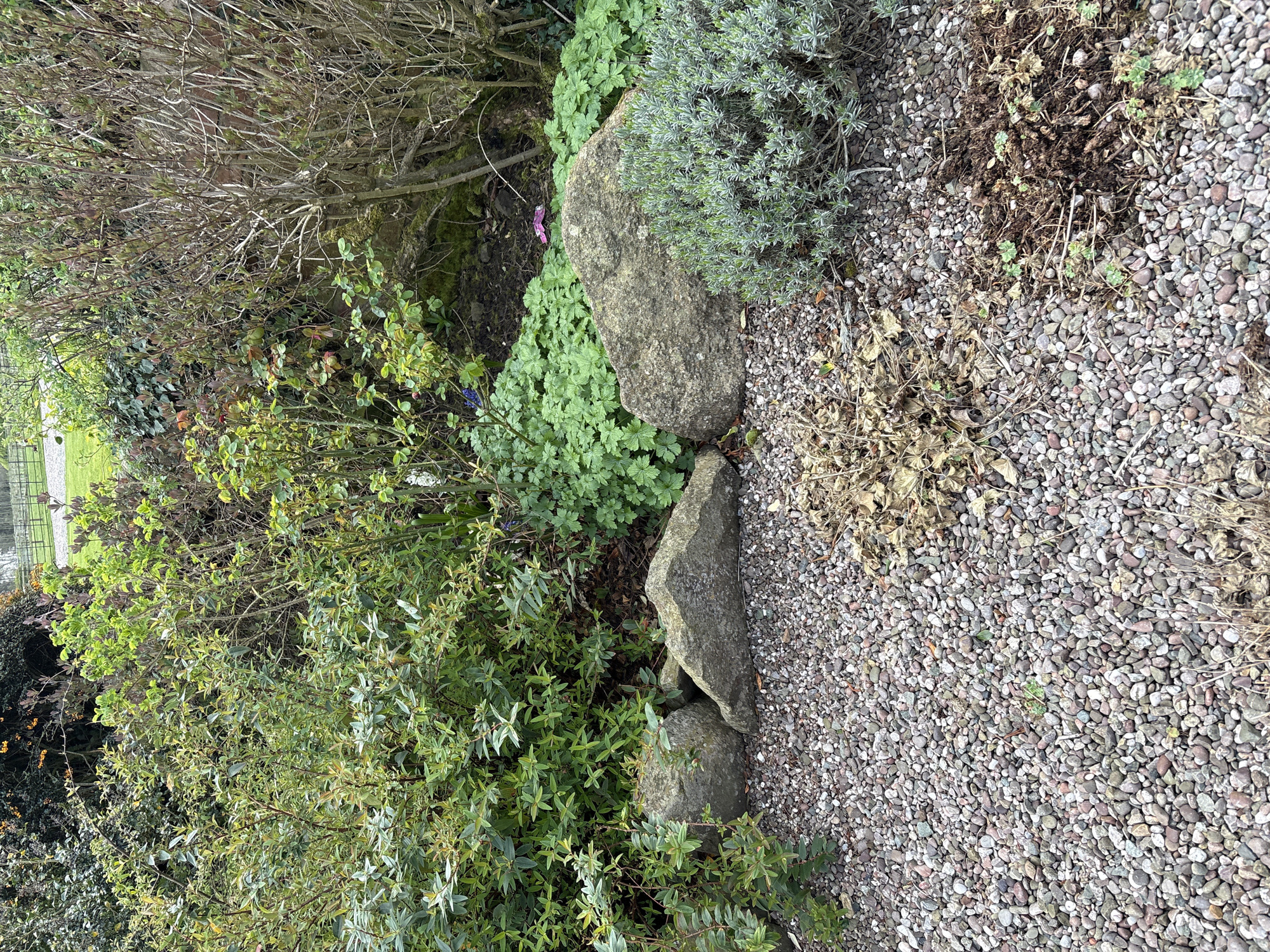 The image depicts a section of a garden or landscape located in Pulverbatch, United Kingdom. The scene is divided between a densely vegetated area and a gravel-covered ground. The vegetated area features a variety of plants, including a bush with small, green leaves, leafy ground cover, a shrub with blue-grey foliage, and a leafless, thorny bush. Several rocks delineate the boundary between the vegetation and the gravel. The gravel area is interspersed with dead leaves and other debris. No people, animals, or human interactions are visible in the scene. The environment suggests a natural or cultivated outdoor setting.