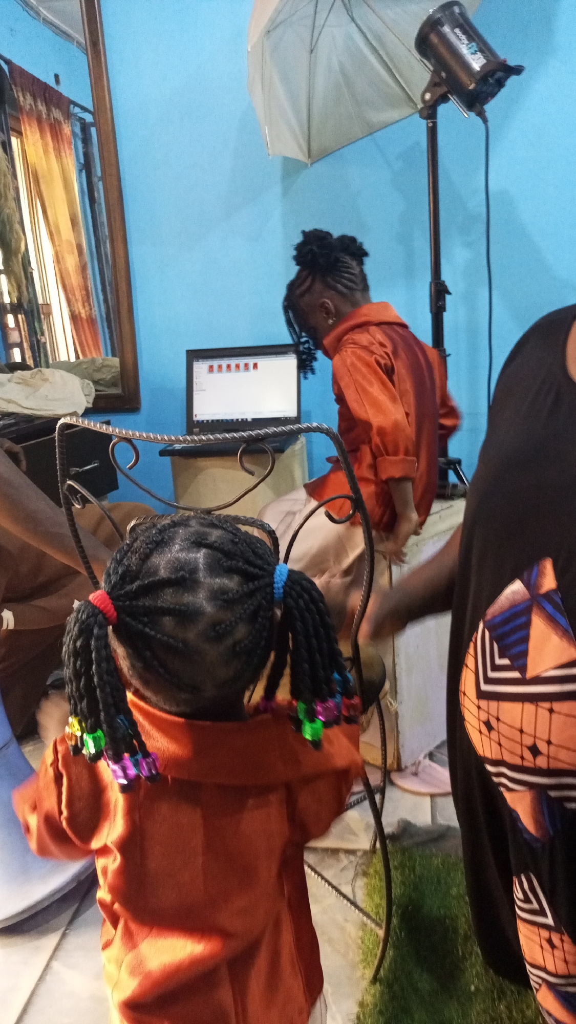 two young girls and part of an adult in what appears to be a small photography studio. The studio has light blue walls, and a photography light with an umbrella diffuser is visible in the background. A laptop sits on a table against the wall, displaying several image thumbnails. The girl in the foreground is standing, facing away from the camera, wearing an orange jacket and her hair is braided into pigtails adorned with colorful beads. The second girl stands closer to the laptop, also wearing an orange jacket, with braided hair styled up. The adult is only partially visible on the right side of the image, wearing a black top with a patterned design. The location is Sabon Tasha, Nigeria.