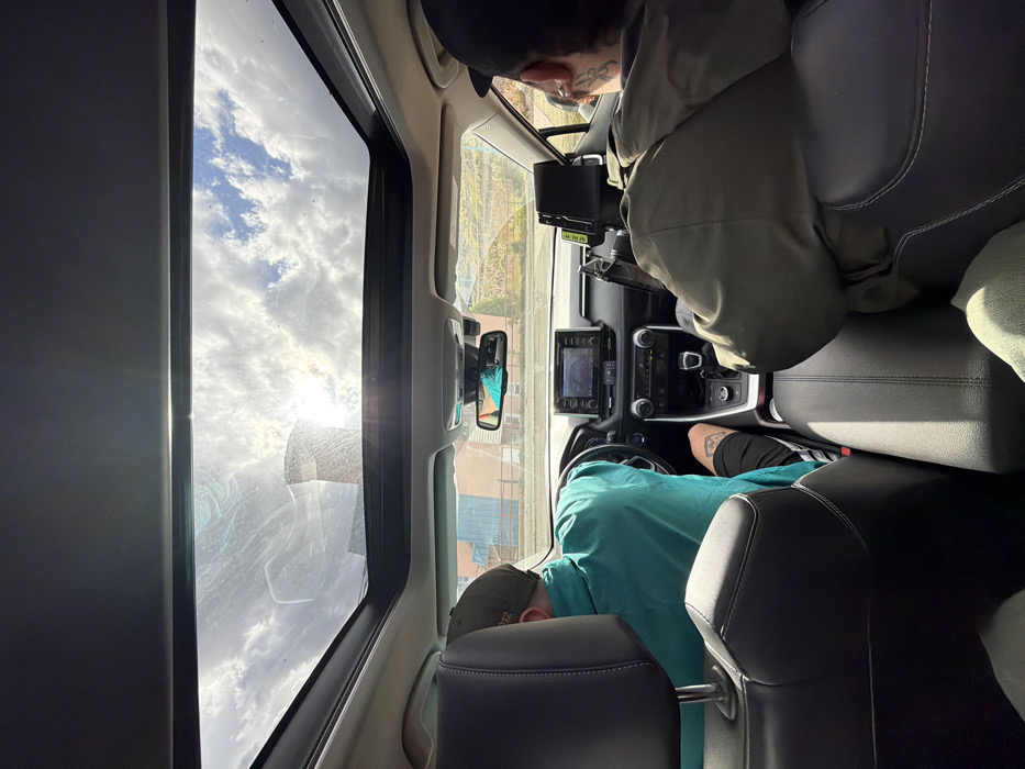The image provides an interior view from the rear seat of a modern vehicle, looking forward. The vehicle's interior features dark upholstered seats, a contemporary dashboard with a central infotainment screen, and a sunroof. Two adult males occupy the front seats. The driver, clad in a teal shirt and a backward dark baseball cap, has his left hand on the steering wheel. A tattoo is visible on his lower left leg. The front passenger wears a dark jacket and a backward dark baseball cap, revealing a tattoo on his neck. A black electronic device, potentially a payment terminal or tablet mount, is affixed to the dashboard in front of the passenger. Beyond the vehicle's windshield and through the open sunroof, a partially cloudy sky is visible, illuminated by bright sunlight which causes glare. Directly ahead, a large, light-colored industrial-style building with pinkish-beige walls and large windows stands behind an asphalt surface. A prominent, gray, cylindrical structure, characteristic of a cooling tower or industrial chimney, is positioned in front of this building. To the right, a distant, grassy, hilly landscape is visible. The scene is located in Ushuaia, Argentina, with the industrial architecture suggesting the vicinity of a power plant or similar facility.