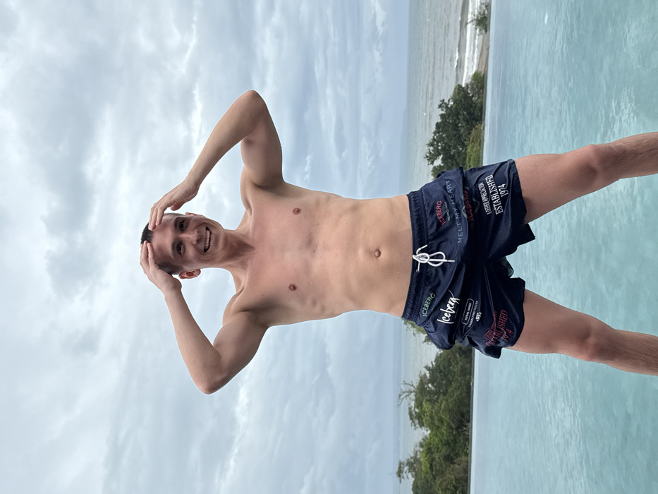 A shirtless man smiles, hands on his head, wearing dark blue Iceberg swim trunks with white logos and drawstring