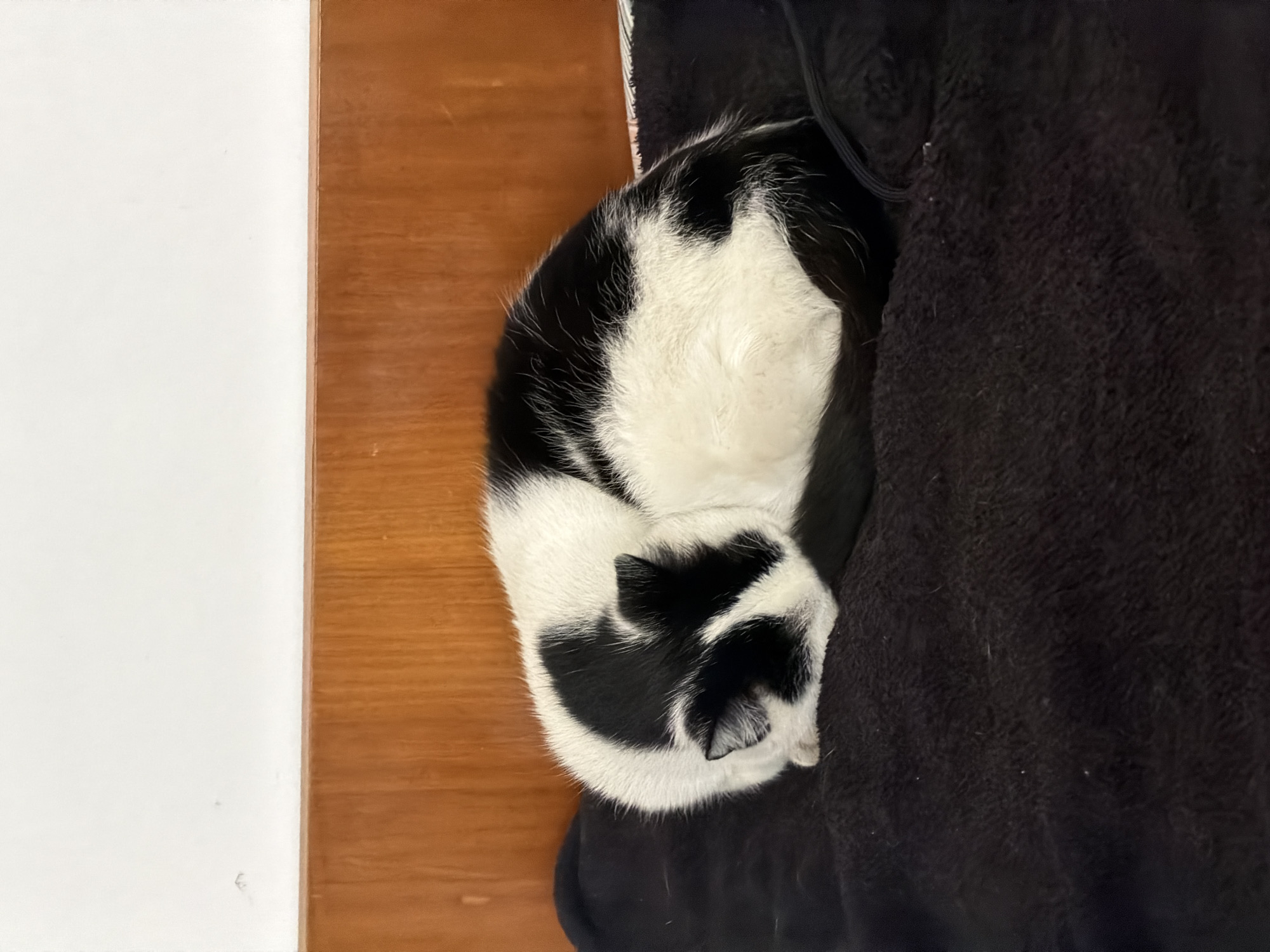 A black and white cat is curled up asleep on a black blanket. The cat is positioned near a wooden surface and a white wall. The image was taken indoors. There is no information available from the image to indicate a location in Bansko, Bulgaria.