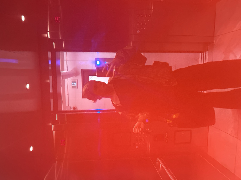 A person stands in a room with a window overlooking a white-tiled space. The individual is holding a device, possibly a phone, pointed towards the window. The room appears to have metallic fixtures, possibly part of a commercial kitchen or a laboratory. A red light washes over the scene, obscuring some details.