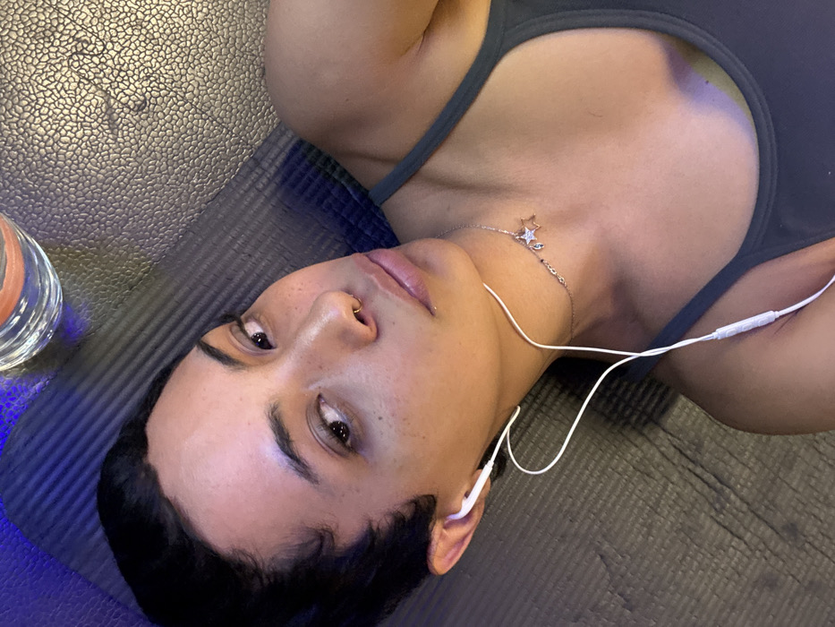 A woman lies on a mat, wearing a gray tank top and a silver necklace with a star pendant. She has earphones in and a nose ring. Her hair is dark and short. A clear glass with an orange substance inside is visible in the corner. The mat has a textured surface, and the lighting is somewhat dim.
