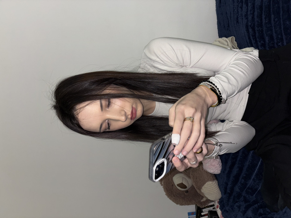 A young woman with long, dark hair lies on a blue textured bed, holding a cell phone. She wears a white long-sleeved shirt and dark pants. She has bracelets on her right wrist and rings on her fingers. A tan teddy bear rests beside her. The background features a plain, light gray wall. The photo is rotated, giving a tilted perspective.