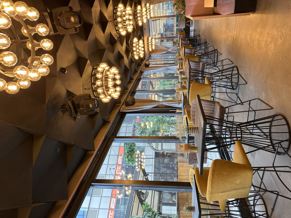 The image displays the interior of "The Olive Tree" restaurant, located within the Paradise Center shopping mall at Blvd. Cherni Vrah 100, Sofia, Bulgaria. The restaurant is currently unoccupied. The scene is characterized by a modern design featuring a dark, geometrically faceted ceiling from which numerous spherical chandeliers, composed of multiple exposed filament bulbs, emit warm, amber light. Additionally, two professional moving head stage lights are mounted on the ceiling. The floor is a polished light gray concrete surface. Along the left side, a long expanse of floor-to-ceiling glass windows provides a view outside to a covered promenade or external mall area. Through these windows, an orange sign with white lettering identifying "ATHLETIC FITNESS" is clearly visible, along with other architectural elements and exterior lighting fixtures similar in style to the interior chandeliers. The restaurant is furnished with rows of dark-topped tables featuring distinct black metal, cage-like bases. Accompanying these are numerous high-backed bar stools upholstered in mustard yellow and gray ribbed fabric. Small potted plants and wooden napkin dispensers are positioned on the tables. A pink upholstered banquette seating area is visible along the right perimeter. Light-colored fabric curtains are partially drawn at intervals along the window wall, and dark-colored speakers are mounted above the windows. No individuals are present within the restaurant or visible through the windows.