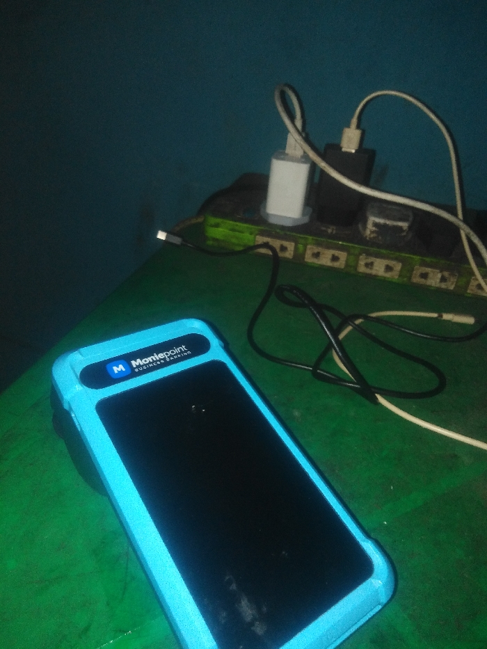 The image captures an indoor scene in Chikaji, Nigeria. A Moniepoint business banking device, encased in a prominent light blue protective shell with a black screen, rests on a green surface. Adjacent to the device, an aged, green-bodied power strip with multiple white outlets is visible. Two power adapters are plugged into the strip: one white and one black, both connected to cables. A black USB-type cable lies loosely near the Moniepoint device. The background consists of a solid teal wall. No individuals are present.