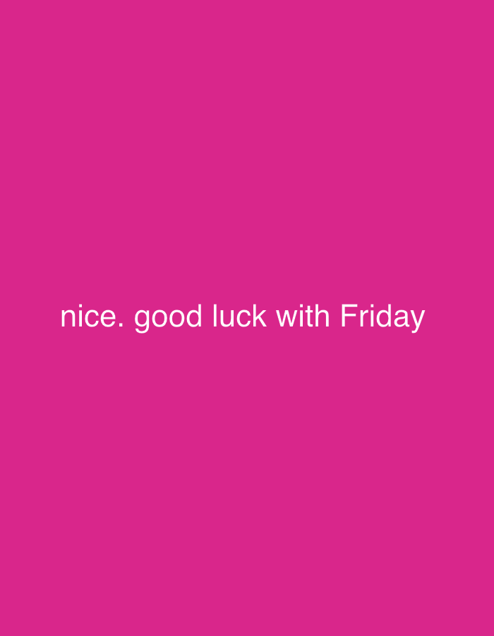 The image displays a solid fuchsia background. Centered horizontally and positioned in the lower portion of the frame is white, sans-serif text. The text reads: "nice. good luck with Friday". No discernible location within Sofia, Bulgaria, or any physical objects, subjects, people, actions, or environmental details are present in the image.