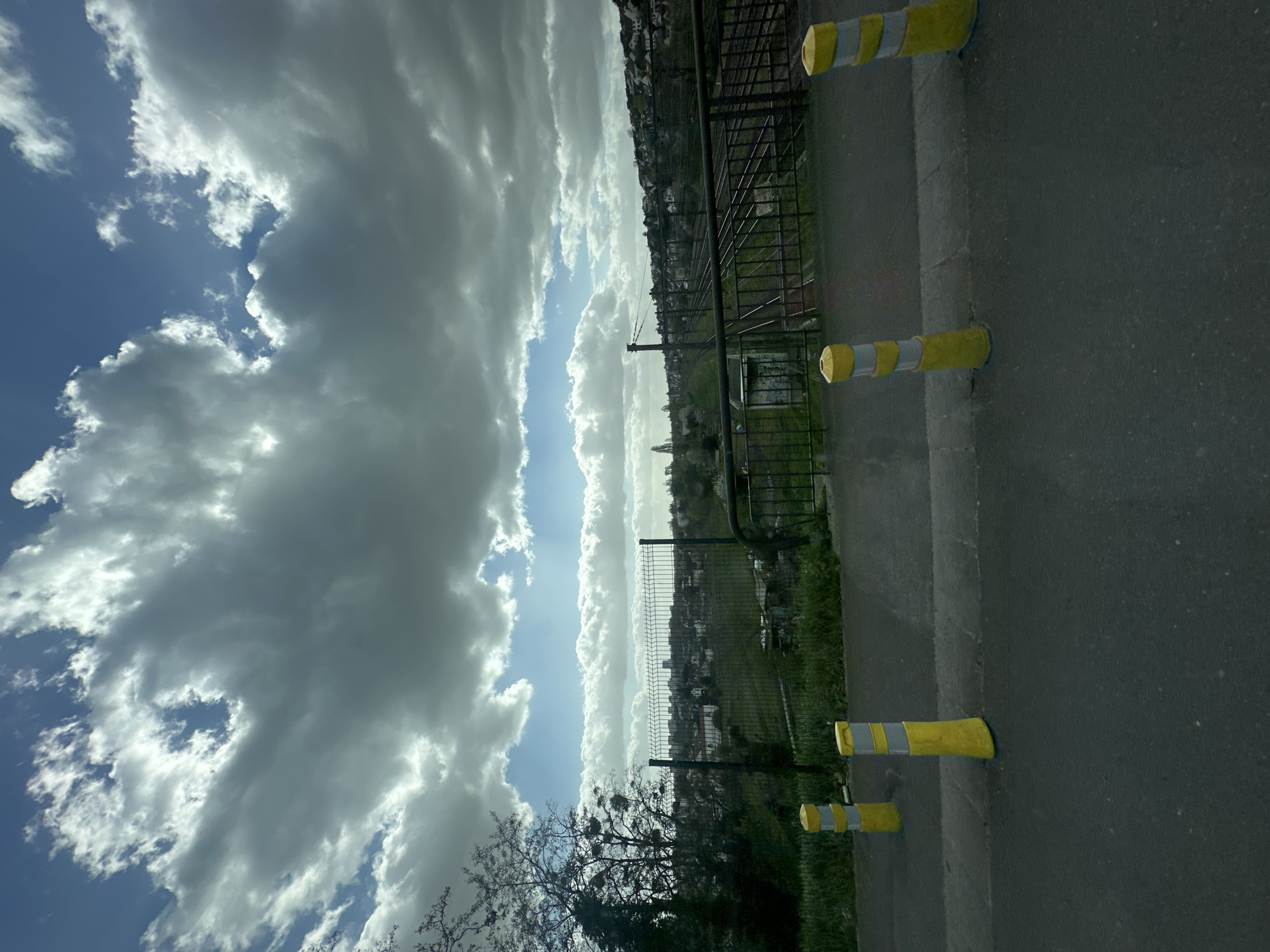 street scene in Juvisy-sur-Orge, France. The view is from a slightly elevated position, looking towards a residential area with houses and buildings visible in the distance. A dark-colored metal fence runs along the edge of the pavement, separating the street from a grassy area below. Along the pavement's edge are several yellow and grey striped bollards. The sky is filled with dramatic clouds, with patches of blue visible. In the foreground are some trees. The pavement surface is dark grey asphalt.