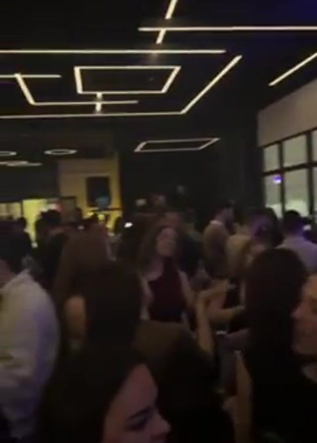 dimly lit nightclub with a modern geometric lighting fixture on the ceiling. Many people are standing and moving, some are dancing. The individuals appear to be young adults dressed in nightlife attire. There is a bar area visible in the background with bottles illuminated on the shelves. A large speaker is on the right. Overall, the setting is a crowded dance club.