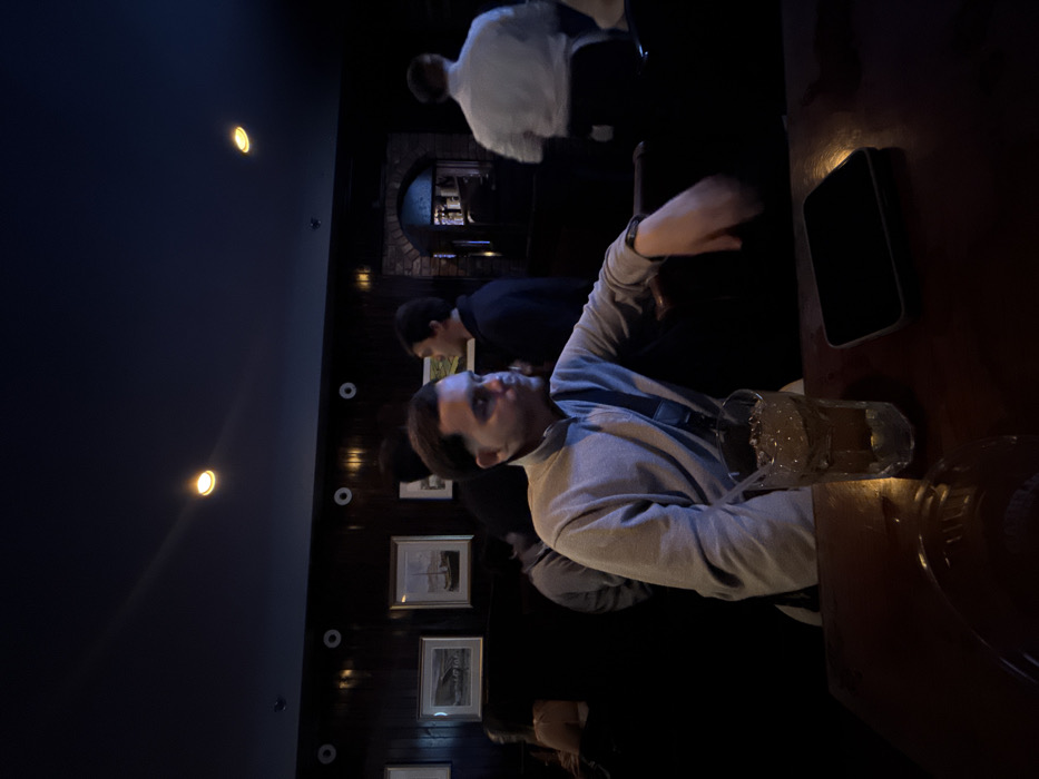 A dimly lit bar scene presents a man in a grey turtleneck sweater, seated at a dark wooden table with a drink and a phone beside it. Several other people are in the background. The bar has dark walls adorned with framed artwork and small, evenly spaced lights. There is a mirrored bar area visible in the back. The scene has a warm, subdued atmosphere.