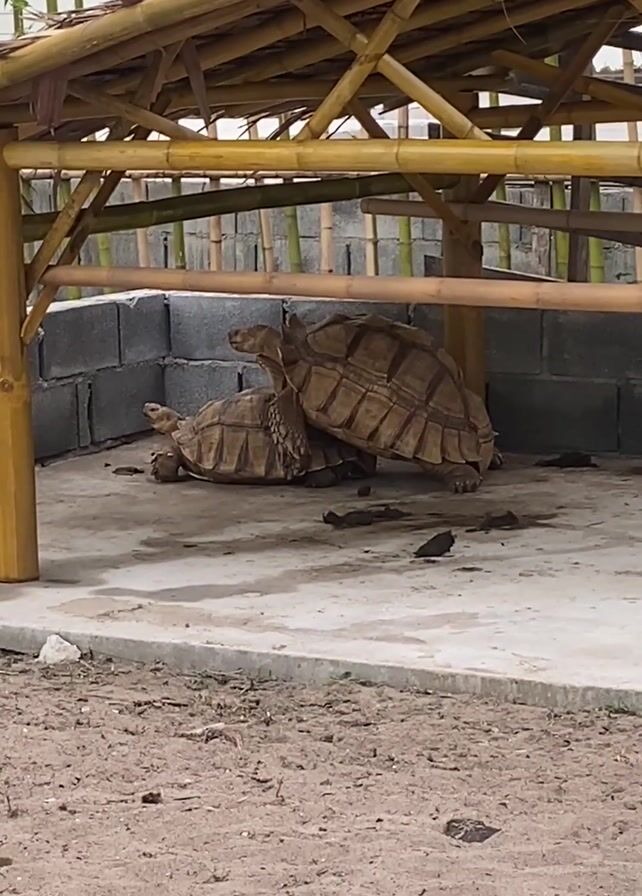 Two tortoises are engaging in mating behavior within a bamboo structure