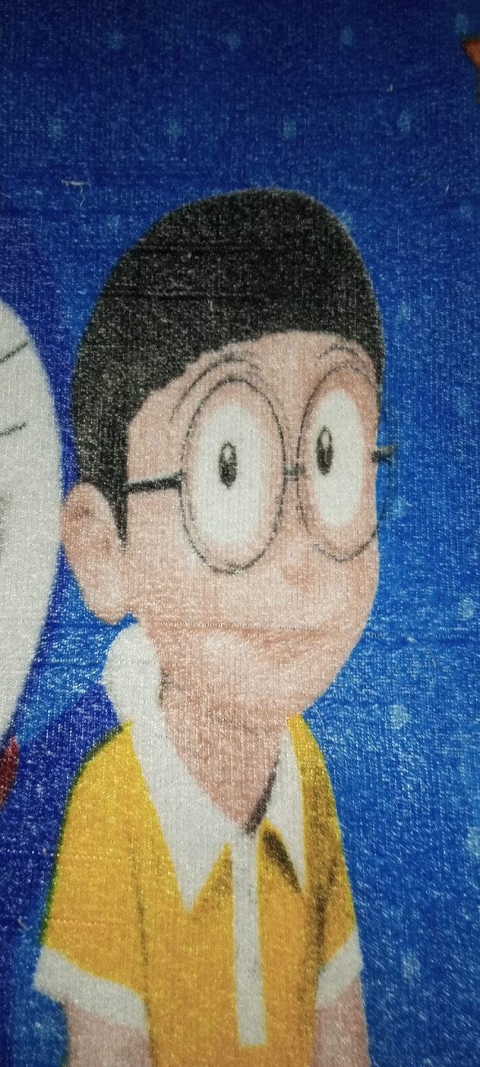 The image depicts a cartoon rendering of Nobita Nobi, a character from the Doraemon series, set against a blue patterned background. Nobita is wearing his signature round glasses, a yellow collared shirt with white trim, and has dark hair. Part of Doraemon's white face is visible on the left side. The image appears to be printed on a fabric material.