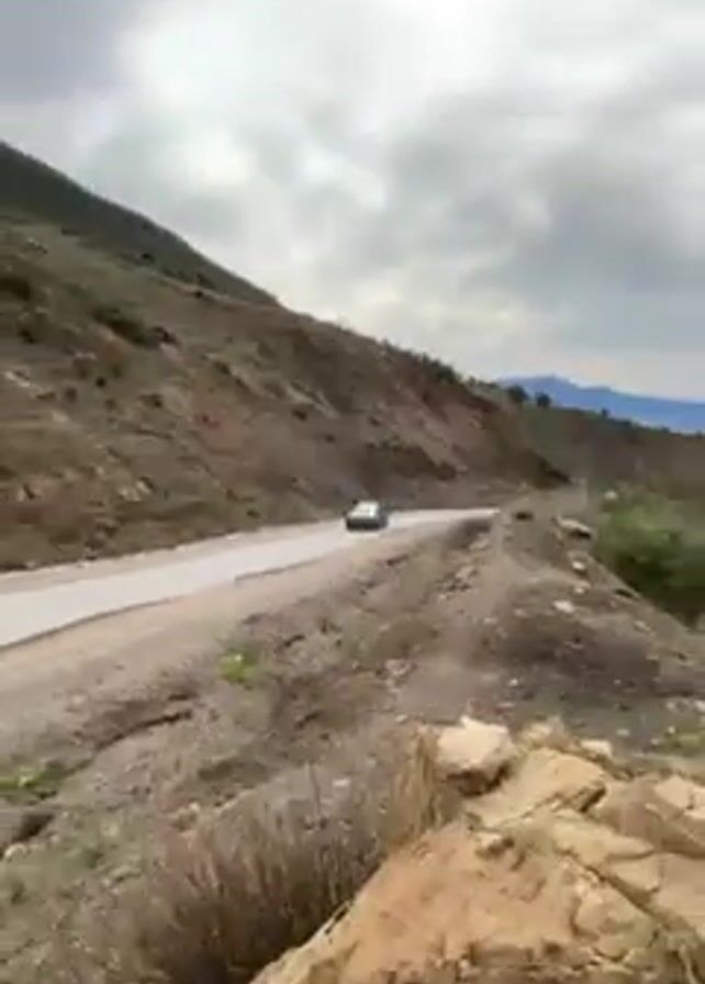 A black car drives on a paved road through a mountainous, dry landscape. The road winds through the terrain, with hillsides covered in sparse vegetation on either side. The sky is overcast, with the sun peaking through the clouds. The camera angle changes slightly, panning upwards to follow the car as it moves along the road. There are rocks and dirt in the foreground, adding to the ruggedness of the scene.