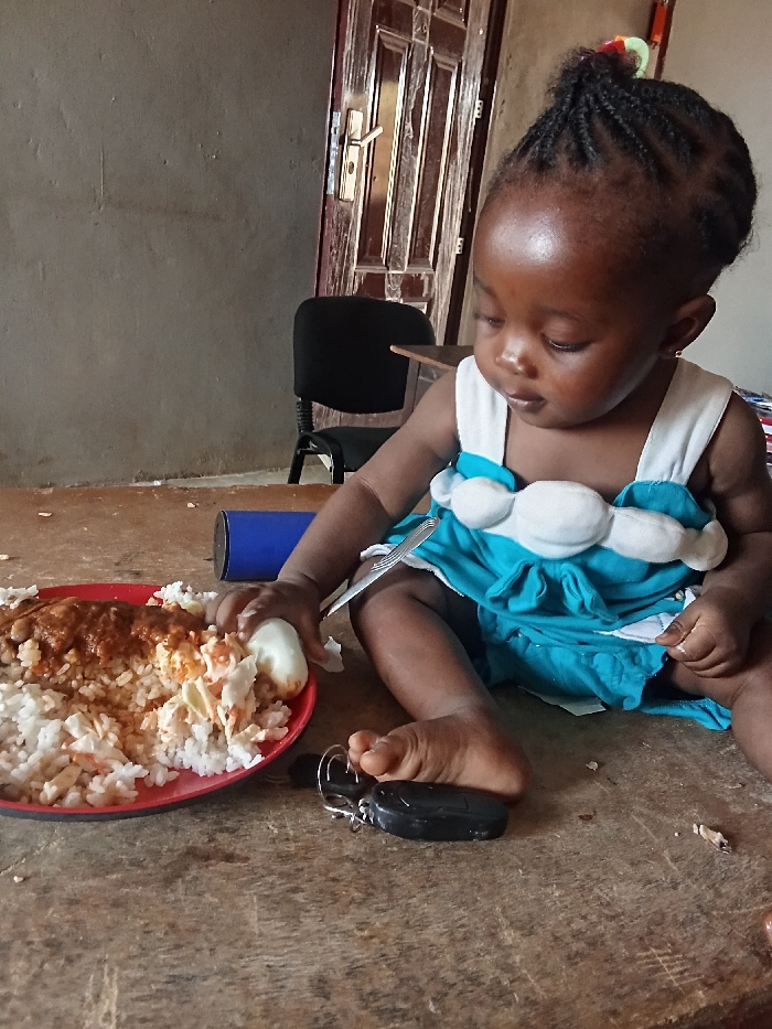 An indoor photograph captures a young child seated on a worn wooden surface, positioned in front of a plain light grey wall, in an unknown location in Unknown, Unknown. The child, with dark skin and braided hair styled into an upward bun, wears a white and teal-blue top with white puffy accents. The child's attention is directed downwards towards a red plate of food. The plate contains white rice, a reddish-brown sauce or stew, and lighter-colored ingredients. The child's right hand holds a white, oval-shaped food item over the plate. A silver fork is tucked into the child's clothing on the left side. A black car key fob with silver rings rests on the wooden surface near the child's right foot. Behind the plate, a dark blue cylindrical object is visible. In the background, a dark brown wooden paneled door with a brass-colored handle is partially visible, along with a portion of a black office chair.
