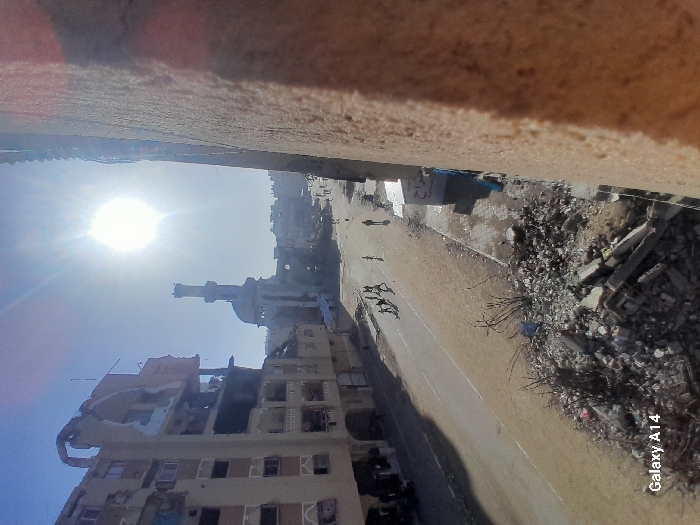war-torn city street under bright sunlight, viewed from above. Buildings display extensive damage and rubble. A mosque with a minaret stands among the damaged structures. Several people walk along the street amidst the devastation. The scene conveys a sense of destruction and resilience in the face of conflict.