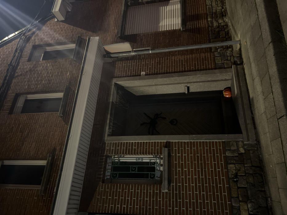 This image displays the nighttime exterior of a two-story building located at number 70 in Mouscron, Belgium. The building features a red brick facade over a grey stone foundation on the ground floor. A white, vertically-slatted overhang extends above the main entrance. The recessed doorway is framed by light grey stone and contains a partially open, dark wooden door. A large, black spider decoration is affixed to the upper portion of the door, with a smaller, dark, circular object suspended beneath it. A small, orange decorative pumpkin rests on the threshold inside the doorway, positioned to the right. To the left of the entrance, a window is secured with dark green or black decorative metal bars. To the right of the entrance, a window is obscured by closed horizontal white slat blinds. Two dark windows are visible on the second floor. A grey metal pole, bearing a light-colored rectangular sign, is situated on the sidewalk to the right of the entrance. The foreground consists of light grey rectangular paving stones. No individuals or discernible actions are present in the scene.