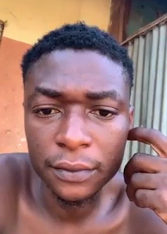 A shirtless African man with short hair is looking directly at the camera. He touches his ear with his finger, then rests his cheek on his hand. He is outside in front of a building with a corrugated metal wall and a beige wall. There is a roof or overhang with electrical wires visible.
