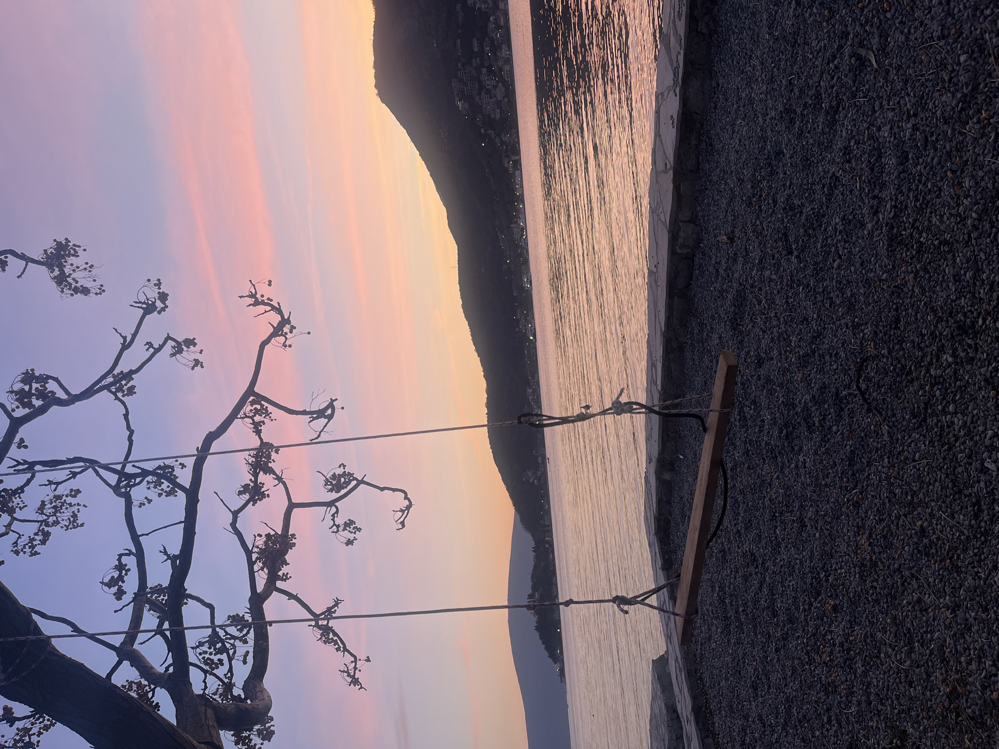 The scene is set at dusk in Lepetane, Montenegro, depicting a coastal view. The sky occupies the upper two-thirds of the frame, transitioning from a light purple at the top to vibrant pink and orange-yellow near the horizon, with horizontal cloud formations. In the foreground, a dark, rocky beach composed of numerous small, dark gray pebbles extends from the bottom of the image. This beach is bordered by a low, irregularly shaped stone wall or barrier. Beyond the wall, a body of water, likely a bay or sea, reflects the warm colors of the sunset, displaying subtle ripples across its surface. A wooden swing hangs from a thick, gnarled tree branch in the upper left. The swing consists of a single horizontal wooden plank serving as the seat, supported by two ropes that are knotted around the plank and attached to the tree branch. The tree branch is largely bare, with visible clusters of small, dark berries or dormant buds. Across the water, the dark silhouette of a mountainous coastline rises against the horizon. Numerous small, illuminated lights are visible along the lower slopes of the distant mountains, indicating the presence of a town or scattered dwellings. No individuals or active interactions are present in the frame; the swing is empty.