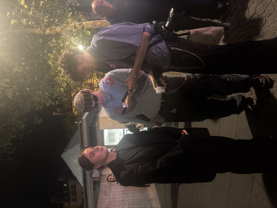 The image depicts an outdoor nighttime scene on Place Colette, Paris, France, adjacent to the distinctive pyramidal entrance of the Palais Royal-Musée du Louvre metro station, which is visible in the mid-background. Three individuals are centrally positioned in the foreground. On the left, a female with dark hair pulled back wears a black oversized blazer over a dark top, standing with hands clasped in front of her, observing the two males to her right. Her expression is neutral. In the center, a male wears a light blue textured sweater adorned with multiple red floral motifs, dark cargo pants with a silver chain hanging from a belt loop, a brown knitted beanie, and dark sunglasses. He is looking down intently at a dark smartphone held in both hands. To the right of the central male, a second male, identified as a photographer, wears a striped light blue and white short-sleeved button-up shirt, dark pants also featuring a silver chain, and glasses. He holds a professional camera with a large lens in his left hand, alongside a detachable flash unit in his right hand. He is also looking down at a smartphone held in his left hand, positioned near the central male's phone. The two males appear engaged with their mobile devices, potentially sharing content or information. Background elements include a light-colored building wall with horizontal ventilation grilles to the left, typical Parisian architecture visible further back, and a tree with sparse foliage on the right side of the frame. The scene is illuminated by artificial light sources, indicating it is night. Additional blurred figures are partially visible in the deeper background.