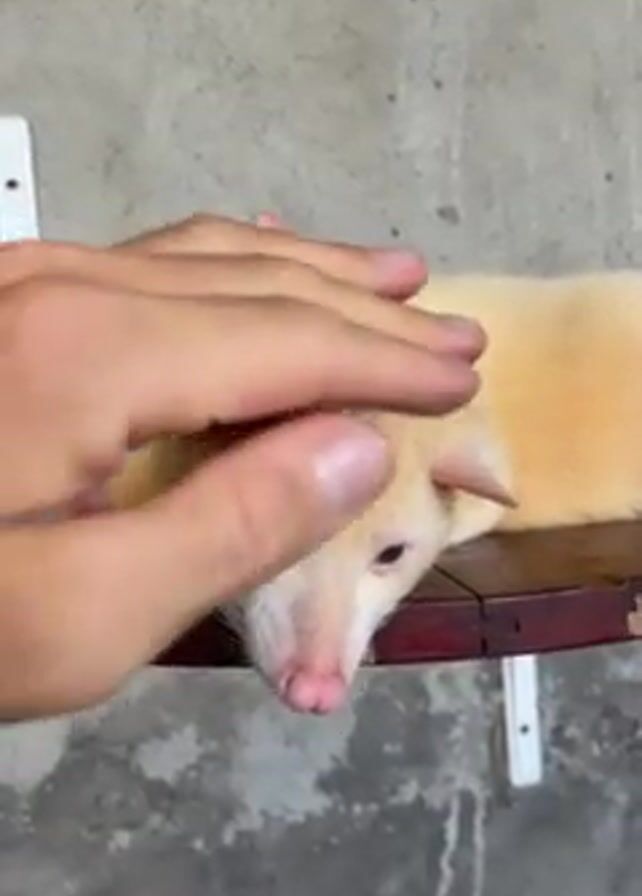 A light-yellow animal lies on a wooden shelf that is mounted to a light-gray wall. The animal's fur is short, and its small ears perk up. The animal has a pink nose and dark blue eyes. A person's hand reaches toward the animal and touches its head and snout. The animal looks around and is generally still during the interaction. The shelf is round, made of dark brown wood, and supported by white brackets. The wall has a rough texture. The setting appears to be indoors.