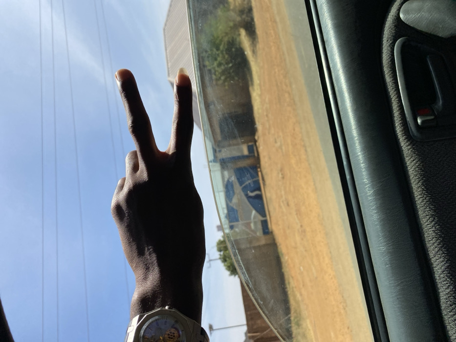 A dark-skinned left hand, adorned with a silver-toned mechanical wristwatch, extends from a vehicle's passenger window, performing a "peace" or "victory" gesture