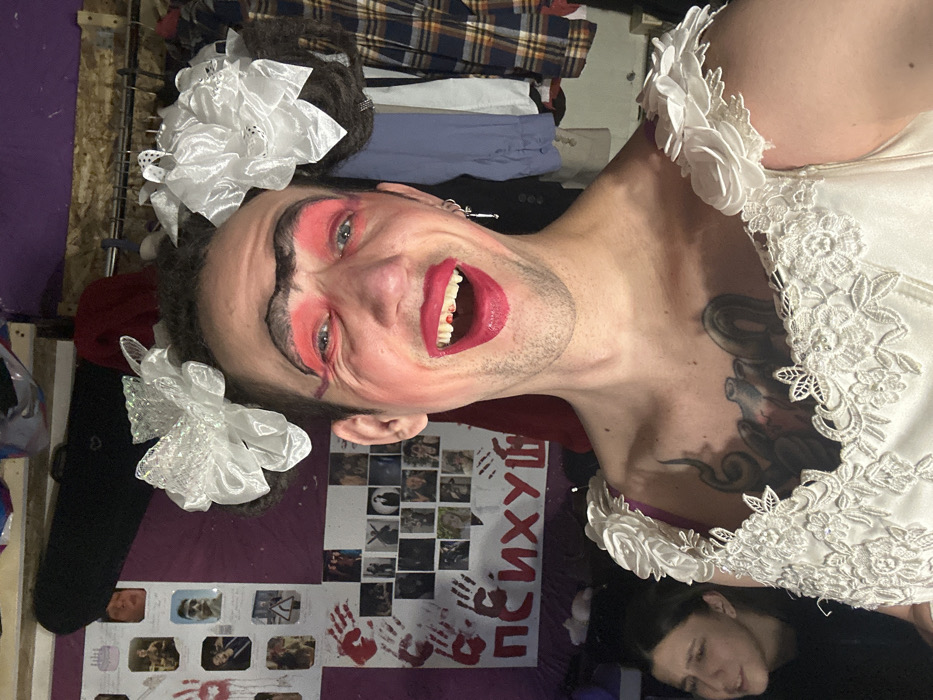 This image depicts an indoor scene in what is presumed to be a dressing room or backstage area in Saratov, Russia. **People:** The primary subject is a light-skinned individual presenting with exaggerated, theatrical makeup and attire. This individual is positioned centrally, facing the camera directly, and is smiling broadly with an open mouth, revealing teeth stained with red lipstick and some dental irregularities. Their facial makeup includes vibrant red eyeshadow extending upwards and outwards, a heavily drawn, dark unibrow, and bright red lipstick. Their dark hair is styled into two prominent buns on top of the head, each adorned with a large, white, multi-layered sheer bow with glitter accents. The individual wears a white, sleeveless dress with lace appliqué and ruffled floral details on the shoulders. A purple bra strap is visible underneath the dress. A large, dark tattoo, appearing to be an octopus or similar cephalopod, is visible on the upper chest. A silver earring hangs from their left earlobe. A second individual, appearing to be a light-skinned female, is partially visible in the lower-left background. Only her head and shoulders are seen. She has dark hair and a neutral expression, looking downwards and slightly to the left, seemingly disengaged from the primary subject and the camera. She wears dark clothing. **Objects and Environment:** The background is cluttered, suggesting a functional rather than decorative space. The wall to the left of the primary subject is a solid dark magenta or purple color. Attached to this wall are various items: - A black hard-shell case, possibly for a musical instrument like a violin, is positioned horizontally in the upper-left. - Multiple photographs and small posters are affixed to the wall. One prominent white poster features several red handprints and the red Cyrillic text "ПСИХУЙ" (PSYKHUY), which translates to "get crazy" or "go mental." Other smaller photos include portraits of individuals and various scenes. The wall or structure to the right and above the primary subject's head appears to be made of light-colored wooden planks. Clothes hang on a rail or hooks in the upper-right background, including a plaid shirt and other garments. The lighting is direct, illuminating the primary subject clearly, while the background is somewhat dimmer.