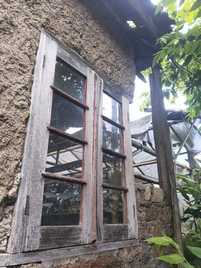 This image captures an exterior view of a building in Kon Tum, Vietnam, focusing on a weathered wooden window. The window consists of two vertical sashes, each containing multiple rectangular glass panes divided by internal, faded red-painted wooden muntins. The wooden frame and sashes are discolored to a grey-brown. The window is set into a wall covered with coarse, light brown stucco. A dark, aged wooden eave, partially damaged, is visible directly above the window. To the right of the window, a robust, dark wooden post extends vertically. Behind this post, a rudimentary structure is visible, constructed from bamboo poles and covered with translucent plastic sheeting. Green foliage from trees and plants partially frames the upper right and lower right portions of the scene. An overcast sky is visible in the background. No individuals or discernible activities are present.