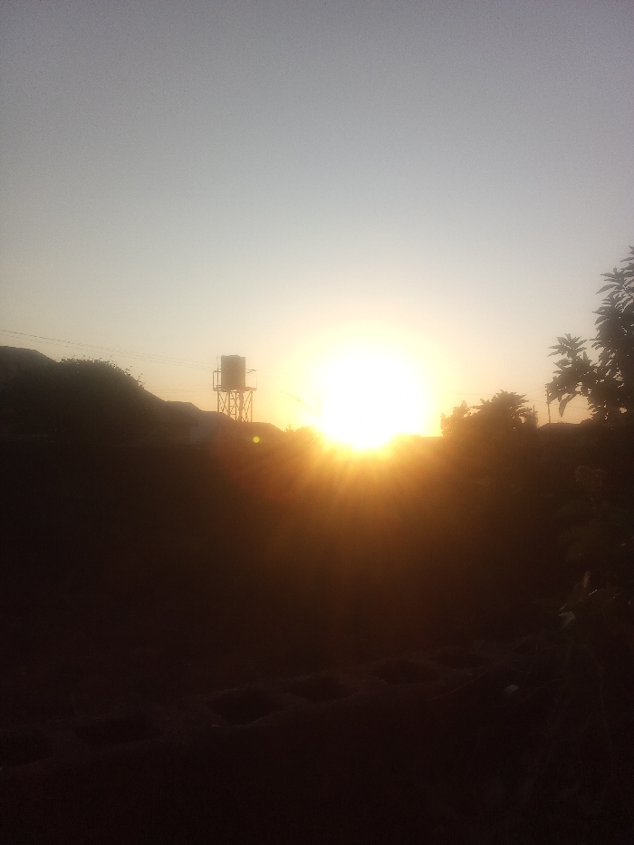 A landscape displays a bright sun, positioned slightly above the center. Silhouetted forms of trees and ground cover occupy the lower half of the image, contrasted by the radiant sunlight. In the background, a water tower stands silhouetted against the sky, adding a human-made element to the natural scene. The sky fades from a light blue to a warmer orange gradient, suggesting either sunrise or sunset.