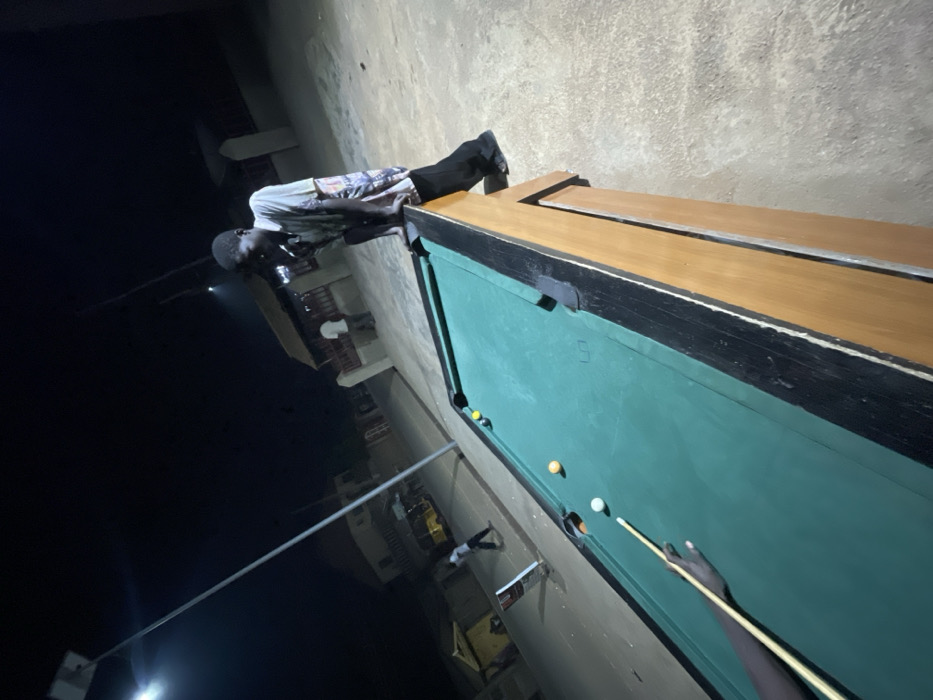The image captures an outdoor night scene in Unguwar Gabas, Nigeria, focusing on a billiards game