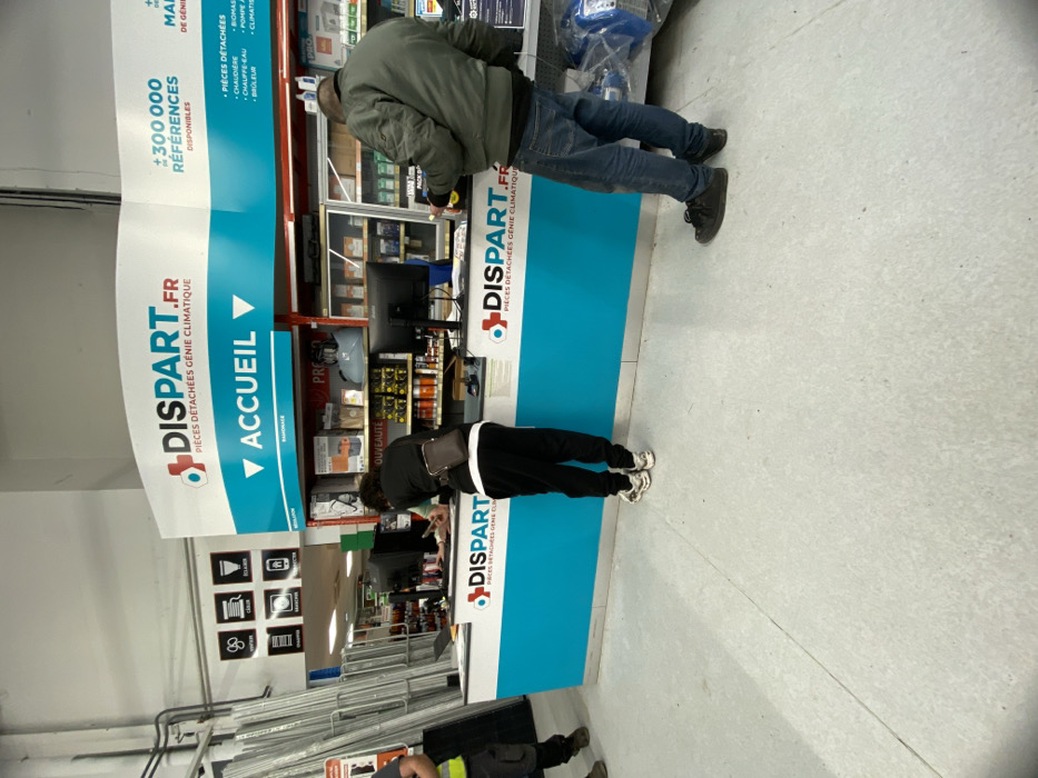 The image depicts the interior of a DISPART.FR store specializing in "PIECES DÉTACHÉES GÉNIE CLIMATIQUE" (HVAC spare parts) in Wasquehal, France. The foreground displays a light gray, textured industrial floor. A prominent blue and white service counter, featuring the DISPART.FR logo and "ACCUEIL" (Welcome) signage, occupies the middle ground. Above the counter, an overhead sign advertises "300 000 RÉFÉRENCES DISPONIBLES." Three individuals are present. Two customers stand at the counter with their backs to the camera. The customer on the left, dressed in a dark top, black athletic pants, and white sneakers, leans forward over the counter, their hands near a black computer monitor. A brown shoulder bag is worn across their body. To their right, a second customer, wearing an olive-green bomber jacket, blue jeans, and dark sneakers, holds and observes a small yellow object in their right hand while standing at the counter. In the far-left foreground, the lower half of a third individual is visible, wearing dark trousers and work boots, with a portion of a yellow high-visibility garment suggesting work attire. Behind the counter, industrial shelving stocked with various products, including smaller items in packaging and larger equipment, is visible. Additional signage with graphic icons is mounted on the left wall above a set of metal racks holding long, silver-colored objects. The environment features high ceilings and an industrial aesthetic.