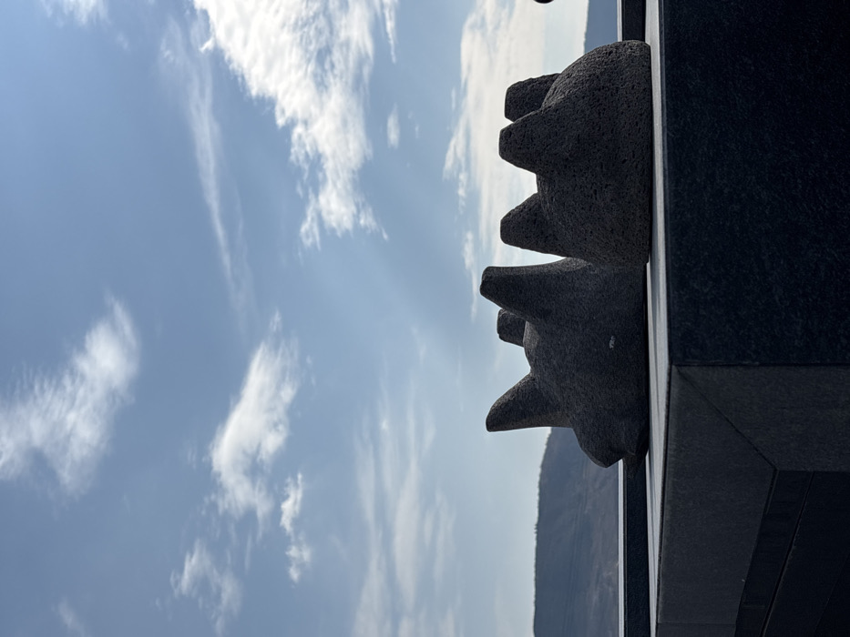 A black stone structure with rounded, tooth-like protrusions stands against a bright sky filled with white clouds. The sky transitions from light blue to a horizon line, where the top of a low, tan-colored mountain is visible. The texture of the stone is granular, contrasting with the smooth, polished surface of the adjacent structure. The orientation of the image is such that the objects appear on their sides.