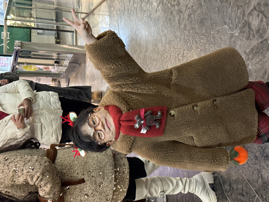 A young East Asian child, approximately 4-7 years old, is depicted smiling broadly and facing the viewer, positioned slightly right of the frame's center. The child wears a brown, fleece-textured coat, a red knitted scarf with a dark brown bear appliqué, red and black plaid trousers, and round, tortoise-shell rimmed glasses. Two small, decorative reindeer antlers are affixed to the child's dark hair. Their right arm is raised, forming a "peace" sign with two fingers, while their left hand holds an orange, pumpkin-shaped object with a green stem near the waist. The scene is an indoor public area, consistent with a transit station or building entrance in the city of Liangjiang, China. The floor is composed of light grey, patterned tiles. In the immediate background to the left, the lower torso and legs of an adult are visible, wearing a sparkling, textured coat and tall, off-white boots. In the central background, an adult wearing a cream-colored puffer jacket holds a white rectangular object. To the right background, multiple metal and glass turnstiles are visible, behind which a green sign with white Chinese characters "入口" (Entrance) is present. Additional figures are partially visible in the distant background.