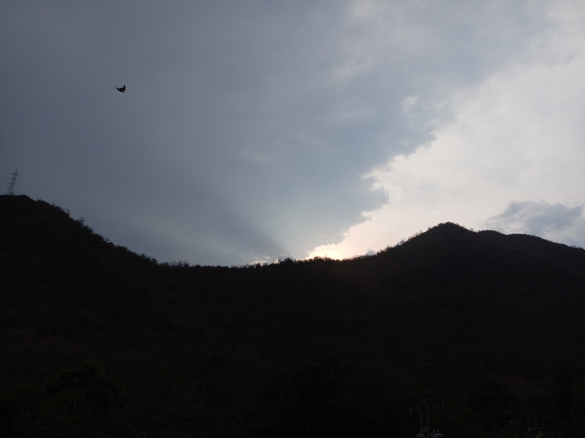 silhouette of a mountain range against a cloudy sky. The sun is partially obscured by the mountains, creating sunbeams. A bird is flying in the sky on the left side. An electrical tower is visible on the left, atop the mountain. The image seems to be taken at dusk or dawn due to the low lighting. The location is likely Las Tejerías, Venezuela, given the prompt. The scene appears to be from a lower elevation, looking upward at the mountains.