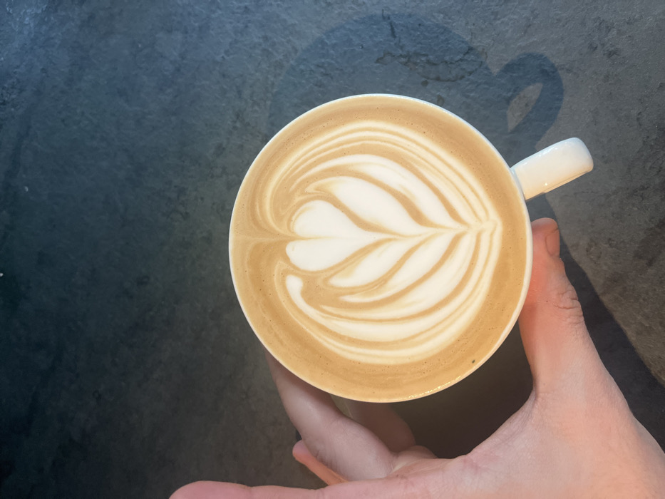 An overhead view captures a white ceramic cup containing a beverage with latte art