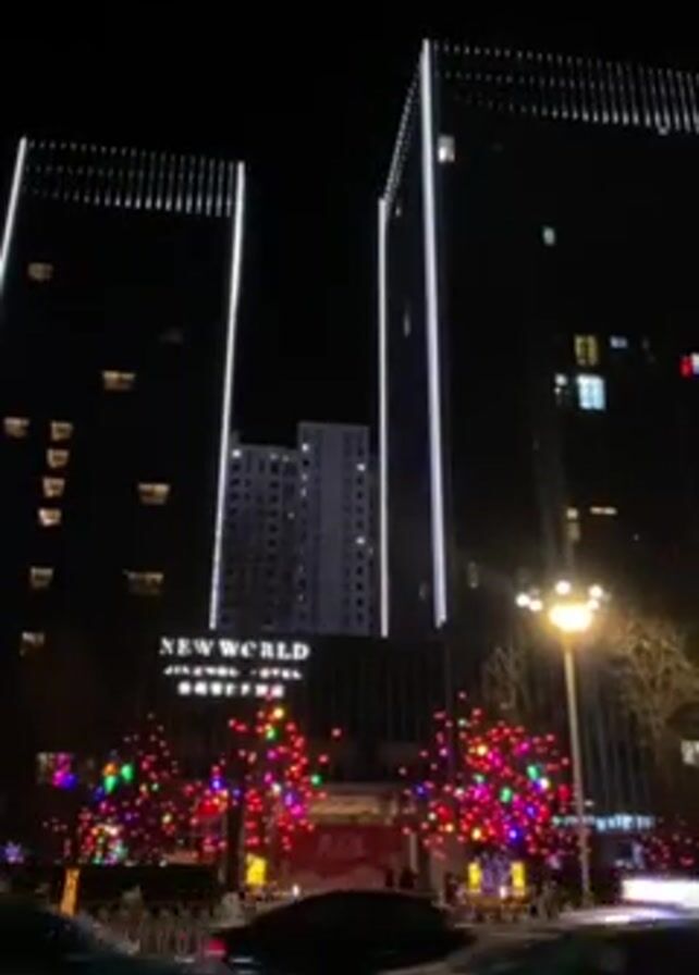 night scene of the New World Jinjiang Hotel in China. The hotel is flanked by two tall buildings with vertical white lights. The hotel entrance is decorated with colorful Christmas lights. A street runs in front of the hotel, and a green taxi passes by.