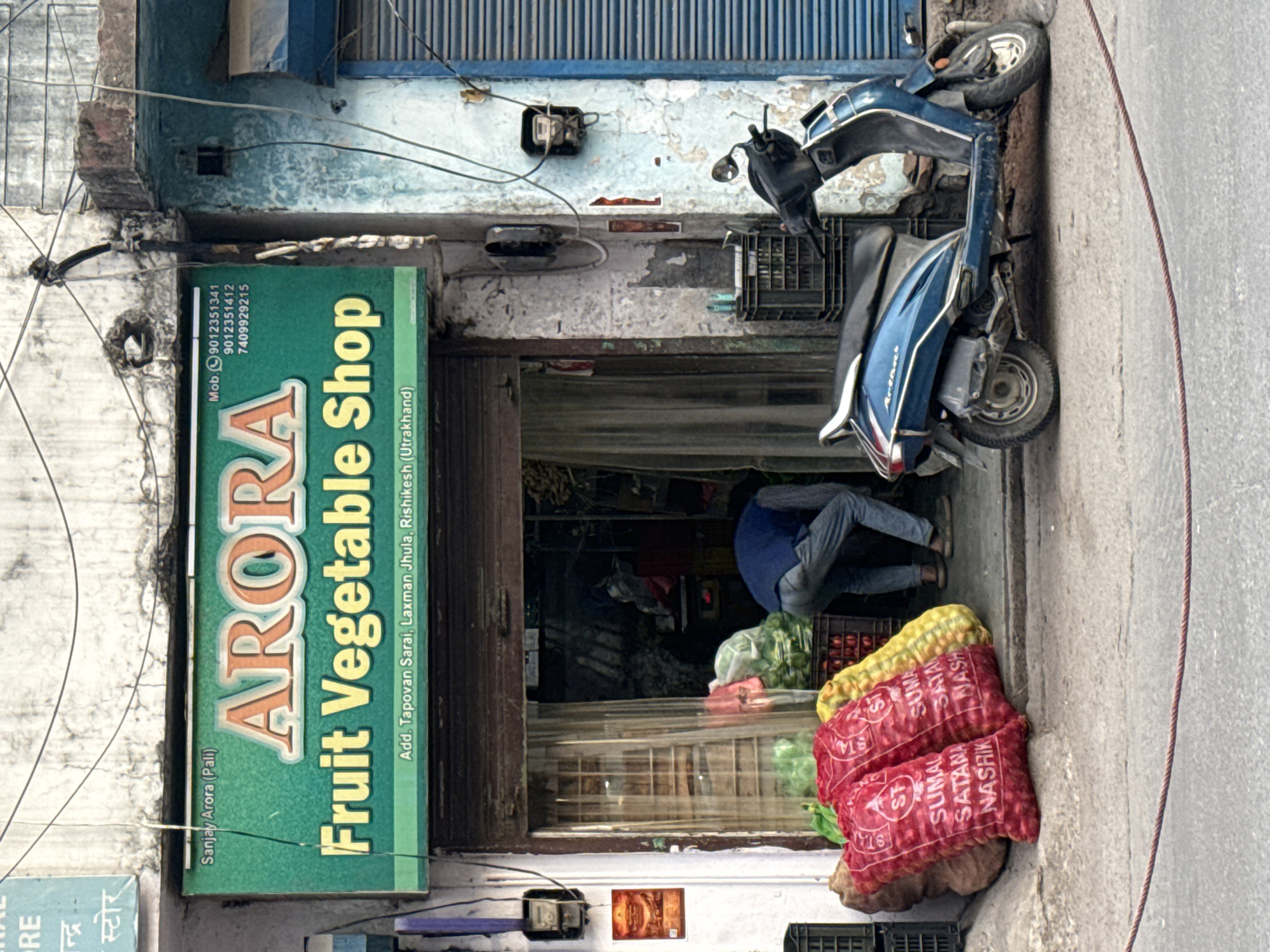 A street-level view shows Arora Fruit Vegetable Shop in Rishikesh, India