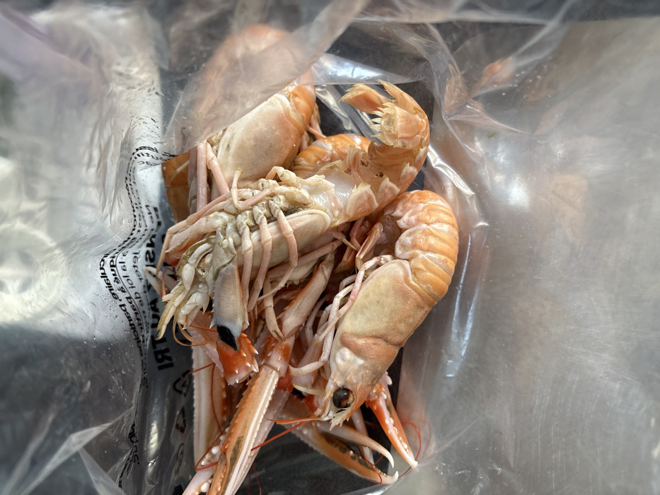 The image displays a quantity of cooked langoustines (Norway lobsters) contained within a transparent, crinkled plastic bag