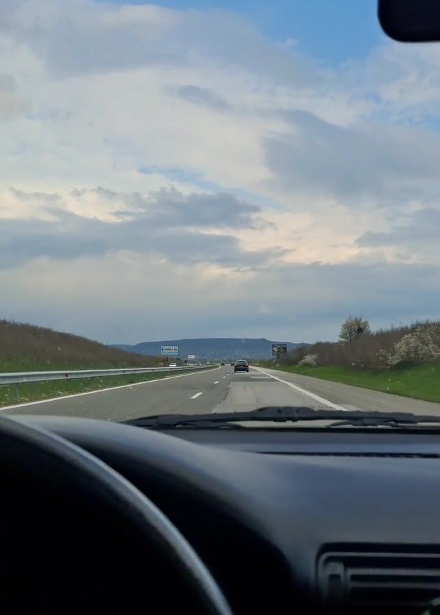 The video depicts a view from inside a car driving down a highway. The car's dashboard and steering wheel are visible in the foreground, with the road ahead stretching towards the horizon. There are other vehicles on the road, including a car in the distance. On either side of the highway, there is grassy terrain with some vegetation. In the background, there are hills or mountains visible under a sky with scattered clouds and patches of blue. There are also roadside signs and billboards. The overall scene suggests a daytime drive on a highway.