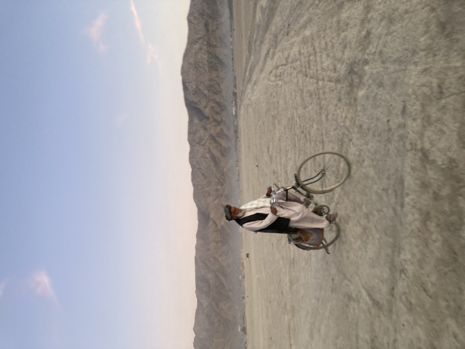 An elderly man in traditional clothing, including a headdress and layered robes, rides a bicycle on a vast, barren landscape. Mountains rise in the background, meeting a hazy sky. The ground appears dry and sandy. The image is rotated counterclockwise, positioning the horizon line vertically. The man is the main subject, seemingly isolated in the open terrain.