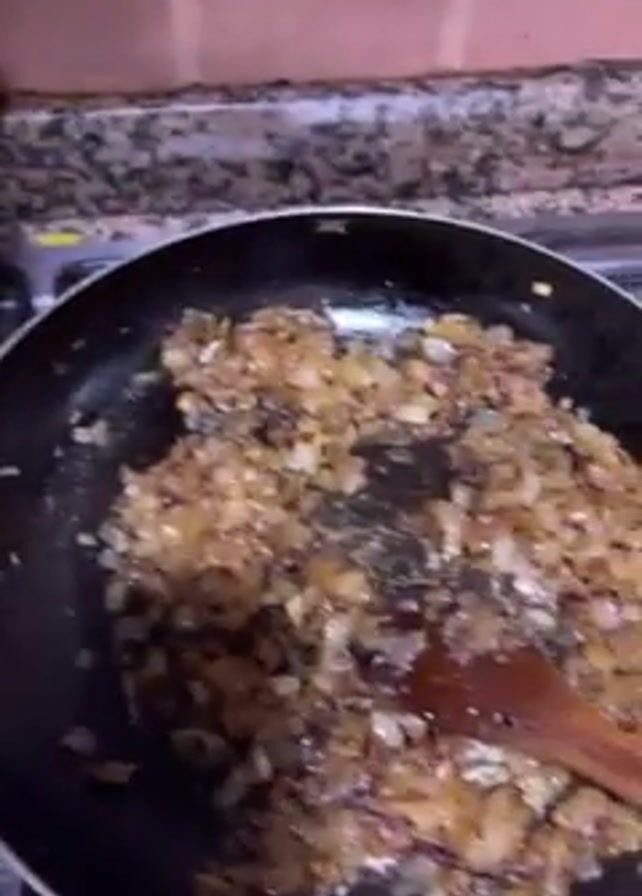 kitchen scene with two pans on a stovetop. One pan contains cooked yellow pasta, and the other has sauteed onions and other ingredients. The stovetop has a stainless steel surface. The background features a tiled wall. A voice is heard speaking in the background.