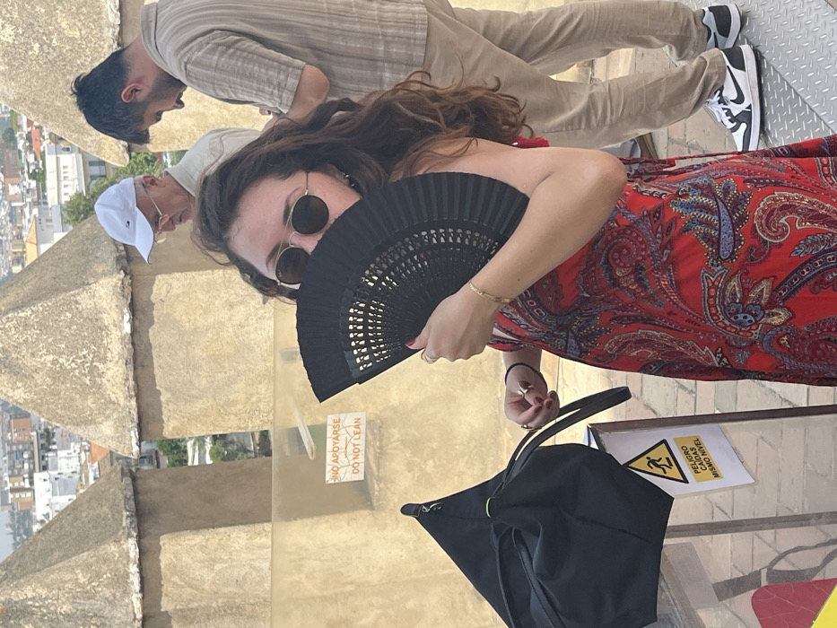 A woman in a red paisley dress and sunglasses holds a black fan, partially obscuring her face. A black tote bag sits nearby on a metallic surface with a warning sign. Two men are visible in the background; one wears a light-colored linen outfit and black and white sneakers, the other a white baseball cap and glasses. They appear to be on an elevated platform with a distant cityscape. A "Do Not Lean" sign is also visible.
