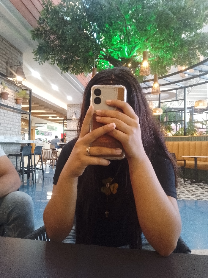 The image depicts an indoor commercial establishment, likely a modern food court or cafe, located in the city of Unknown, Unknown. In the foreground, a person is seated at a dark table, facing the camera. Their face is completely obscured by a light-colored smartphone (consistent with an iPhone, featuring two camera lenses and a clear case) held horizontally by both hands. The person has long, dark hair, wears a black top, a necklace with a multi-leaf clover pendant and a silver cross, and a silver-colored flower ring on their left ring finger. To the immediate left, a portion of another individual's leg, clad in blue jeans, is visible. The background reveals a spacious area with various seating arrangements and contemporary decor. To the left, a section features a light-colored brick wall with wall-mounted potted plants and industrial-style light fixtures. A counter area with black high-back bar stools and additional wooden chairs and tables are visible, occupied by indistinct figures. To the right, a booth seating area with yellow-tan upholstered benches and dark tables is present. Overhead, numerous hanging light fixtures with woven shades illuminate the space. Prominent artificial foliage, resembling large trees, is visible, with a section illuminated by a distinct green light source. The floor is a light blue, possibly tiled, and the ceiling structure includes exposed beams, suggesting an open architectural design. Several blurry figures are discernible throughout the background, indicating a public, active setting.