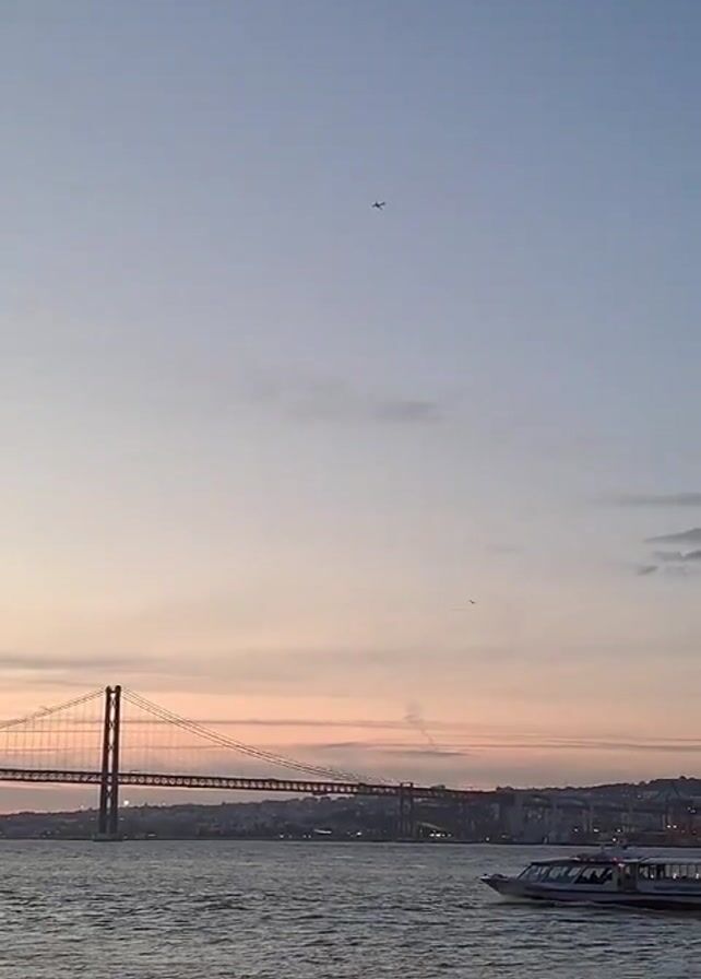 suspension bridge, water, a boat, and a sky. The sky is a gradient of colors ranging from blue to orange, suggesting either sunrise or sunset. The bridge is a suspension bridge with a visible framework and towers. The water is choppy with ripples. A boat is moving across the water, appearing to be a passenger boat with people visible on board. The background shows a coastline with buildings and cranes. There are two planes visible in the sky, and several birds.
