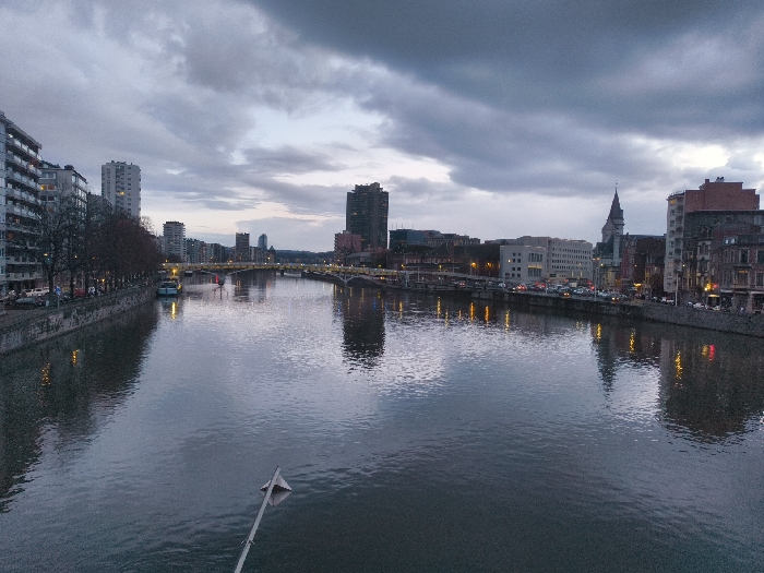 - "The image displays a wide, overcast urban river scene in Liège, Belgium, likely viewed from a bridge or elevated structure" by FM-NjbJq2, licensed under CC BY 4.0