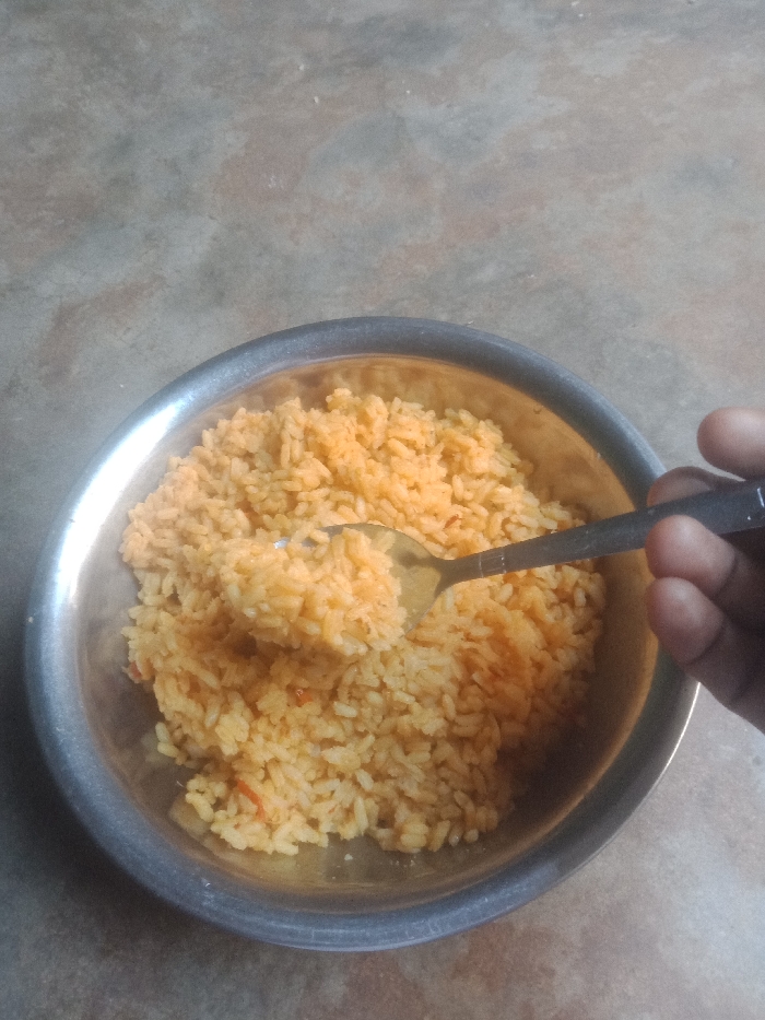 - "The scene captures an overhead view of a metal bowl containing orange-tinted rice, situated on a textured, light gray concrete or unpolished tile surface" by FM-Fm7VJ2, licensed under CC BY 4.0