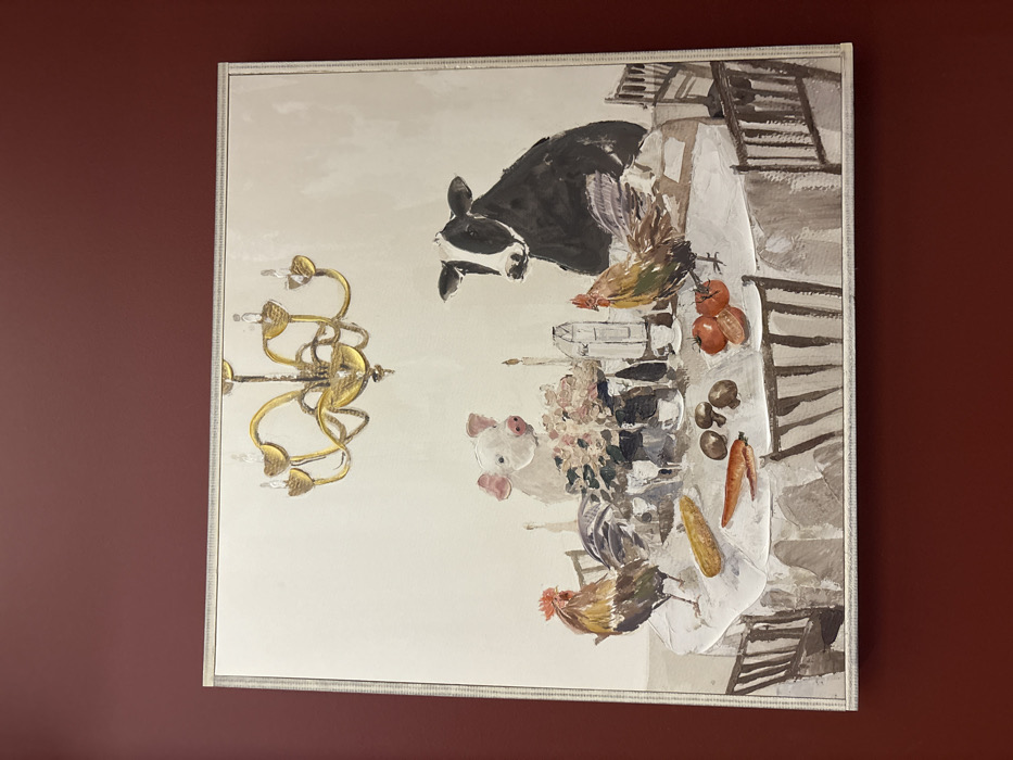 An oil painting of a dining table scene. A black and white cow, two chickens, and a pig overlook the meal. A chandelier hangs to the side. The table is set with tomatoes, mushrooms, carrots, corn, flowers, and bottles. Chairs are positioned around the table. The painting has a textured, three-dimensional effect. The artwork is framed. The wall it hangs on is a deep red color.
