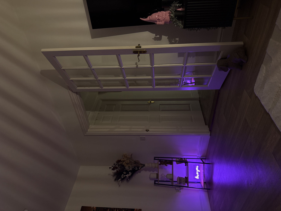 The image depicts an interior residential scene located in the city of Mid Suffolk, United Kingdom, characterized by dim ambient lighting and purple illumination. No individuals are present. The focal point is an open, white-painted French door with multiple glass panes, positioned off-center to the right, revealing a glimpse into an adjacent room or hallway with another open white paneled door. Both doors feature brass-colored handles. To the left, against a white wall, stands a black three-tiered metal shelving unit with wooden shelves. On the top shelf, a white vase holds a bouquet of dried flora, predominantly brown and white with hints of red. The middle shelf displays a white cylindrical object, a small white figurine, and a dark brown bear-shaped figurine. The bottom shelf contains a small white object and a purple neon sign, glowing intensely and spelling "love you," which casts a significant purple light across the laminate flooring and lower wall. A framed artwork is partially visible on the far left wall. To the right of the French door, a dark, fluted console table supports a large pink ceramic garden gnome figurine with a pointed hat and a small pot with green foliage. Behind the console table, a large, dark rectangular surface, possibly an unlit television screen, reflects some of the room's light. On the wooden laminate floor, near the base of the open French door, rests a small, brown, patterned plush toy resembling a dog. A section of a white textured rug is visible in the bottom right foreground. Diagonal shadow patterns are cast on the white ceiling above the French door, indicating an external light source or architectural feature. The floor throughout the visible area is a warm-toned wooden laminate, and all walls and skirting boards are white.