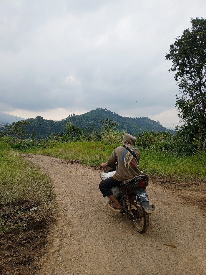 A single individual operates a dark-colored underbone motorcycle on an unpaved, uphill dirt road. The scene is located in Thotagamuwa, Sri Lanka, although the motorcycle's rear license plate, 'F 5885 06', corresponds to vehicle registrations from Bogor, Indonesia. The rider, viewed from behind, wears a light brown hooded jacket with a faded multi-colored graphic on the back, dark trousers, and sandals. A white sack, likely containing goods, is secured behind the operator on the motorcycle's seat. The environment is rural, characterized by lush green vegetation, tall trees, and rolling hills covered in dense forest, visible under an overcast sky. Distant residential structures can be discerned on the left horizon, nestled among the hills.